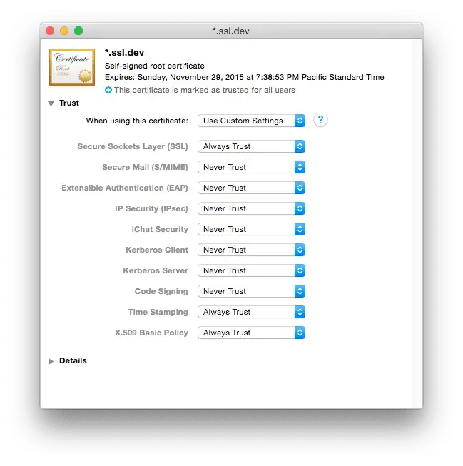 Knowing that Chrome won’t accept a first-level wild card certificate, I created (self-signed) another, with the domain set at *.ssl.dev. Make sure to add another line to your Dnsmasq configuration to ensure these new domains resolve correctly, address=/.ssl.dev/127.0.0.1. If you’re following the pattern for adding vhosts outlined previously, create a symlink to the folder you want to server over HTTPS, ln -s ~/sites/test.dev ~/sites/test.ssl.dev.