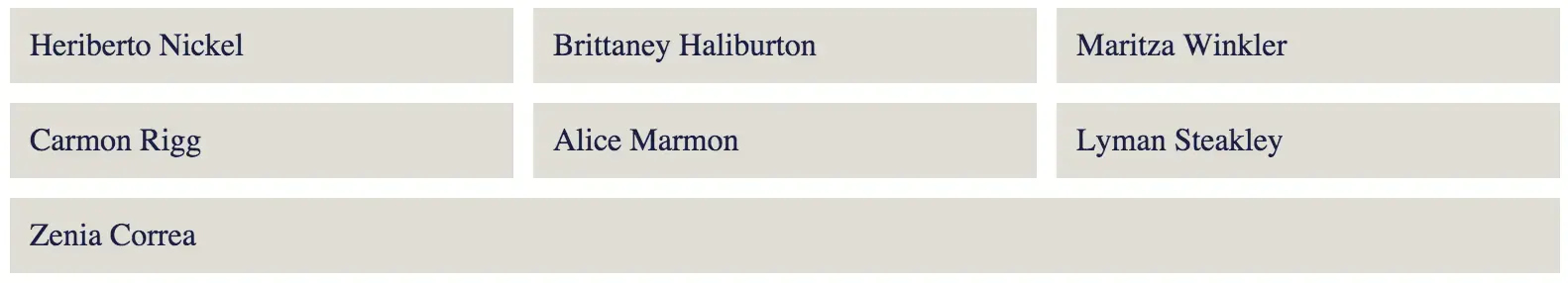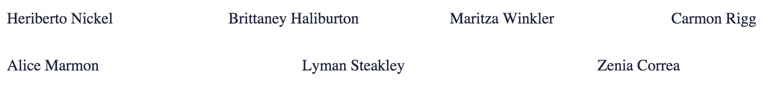 <div class="items"> <div class="item">Heriberto Nickel</div> <div class="item">Brittaney Haliburton</div> <div class="item">Maritza Winkler</div> <div class="item">Carmon Rigg</div> <div class="item">Alice Marmon</div> <div class="item">Lyman Steakley</div> <div class="item">Zenia Correa</div> </div>