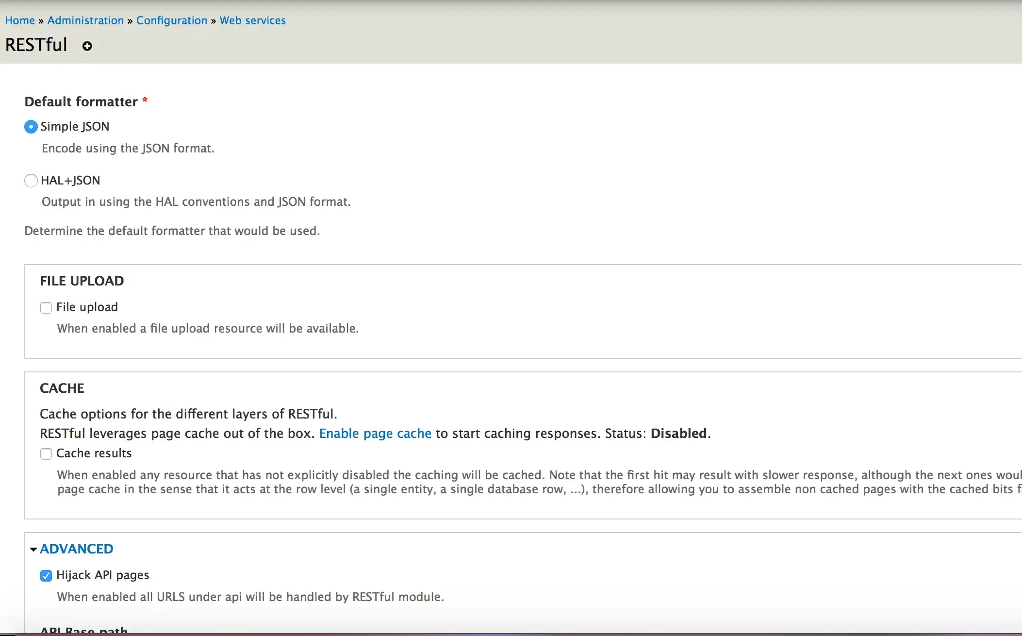 Now let’s take a look at the RESTful configuration page. We aren’t going to touch anything today (don’t worry we’ll take a look in the weeks to come) — just showing you where it is and the options you have available (/admin/config/services/restful).