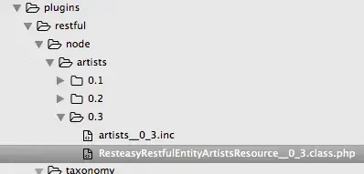 artistsfolder which will help us define our first RESTful plugin:plugins/restful/node/artists/0.1/plugins/restful/node/artists/0.1/artists__0_1.inc— This will hold our plug in definitionsplugins/restful/node/artists/0.1/ResteasyRestfulEntityArtistsResource.class.php— This will hold an implementation of the Restful Entity Resource class specific to our endpoint. Sure it’s a bit long winded, but the verbosity might pay off in the the debugging stack.