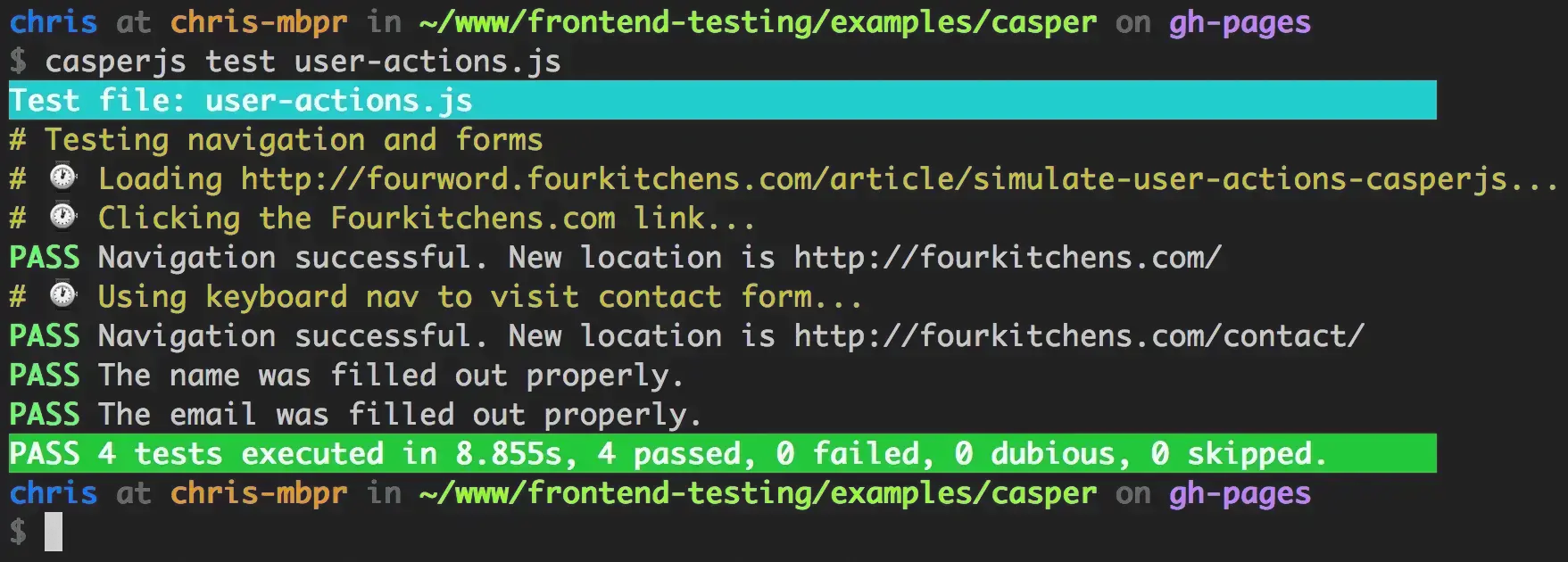 Note: if your source code shows little boxes instead of a clock inside the Casper comment, it’s because your browser doesn’t display emoji properly. It doesn’t affect the test because it’s just a visual cue that a momentary pause is expected while the test runs.