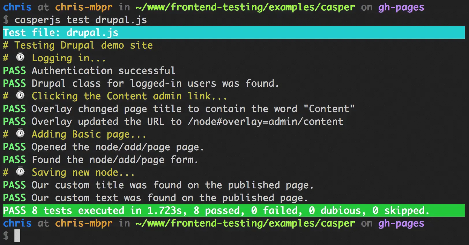 Here’s an excerpt of my recent DrupalCon Amsterdam presentation which walks through this very CasperJS test for Drupal. We will click around the site manually and observe what happens, to see what the test should look for. Then the script will perform the exact same actions described in this article, resulting in a published node and a beautiful green PASS after finding the fake content entered on the previous form.
