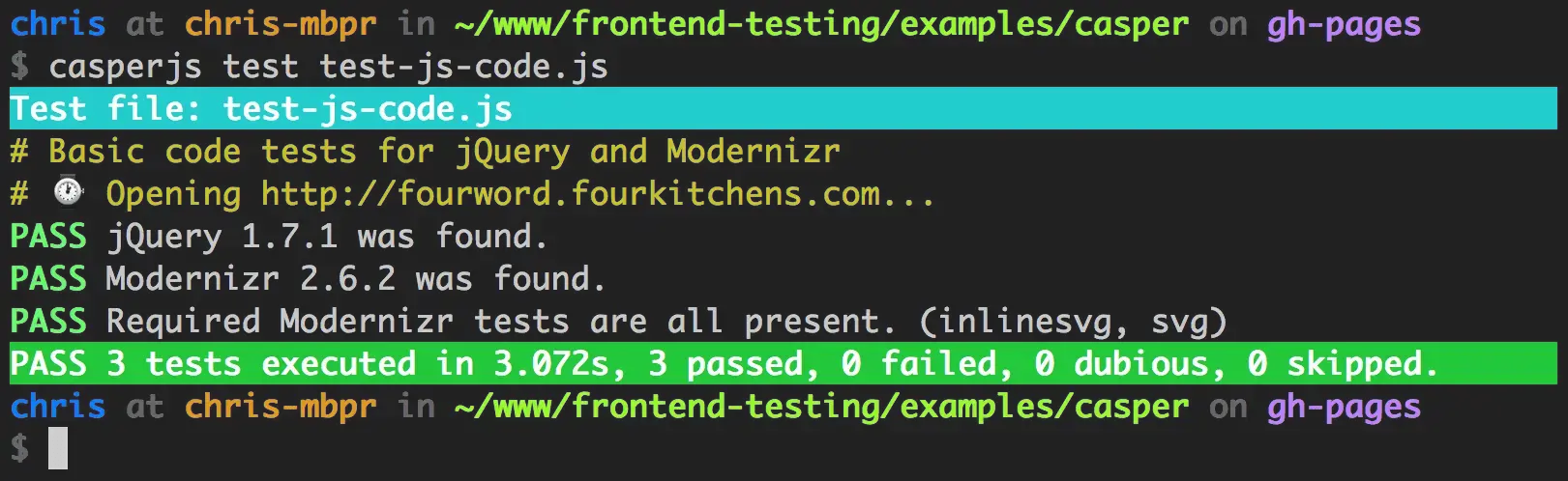 jQuery.fn.jquery and Modernizr._version, produce the values that we hardcoded into our test. If these libraries were to be updated, their versions would change and our Casper test would alert us.Testing the Modernizr object