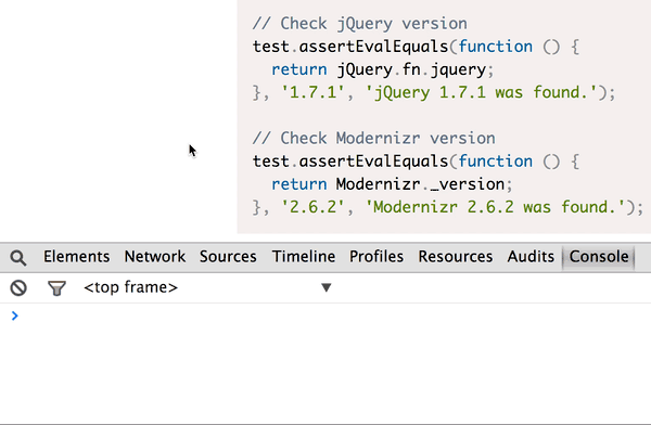 In our examples we will test a few properties of jQuery and Modernizr, two very common JS libraries. All the techniques shown here can be easily adapted to test custom libraries that you have written, or use within your organization.
