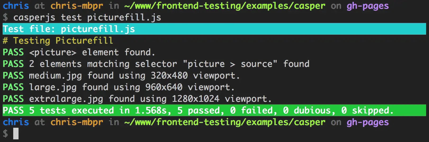 Unless all five individual tests pass, the overall Testing Picturefill test will not report a pass. So, once again in plain english, here is the series of steps that Casper will complete in order to test Picturefill: