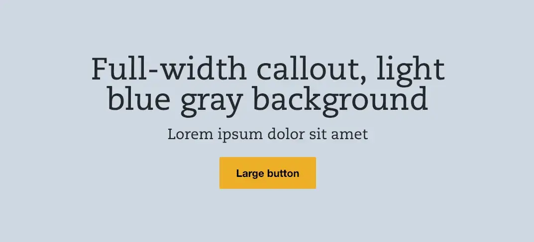 # Text callout_title: 'Full-width callout, light blue gray background' callout_subtitle: 'Lorem ipsum dolor sit amet' # Button callout_button_text: 'Large button' callout_button_url: '#'